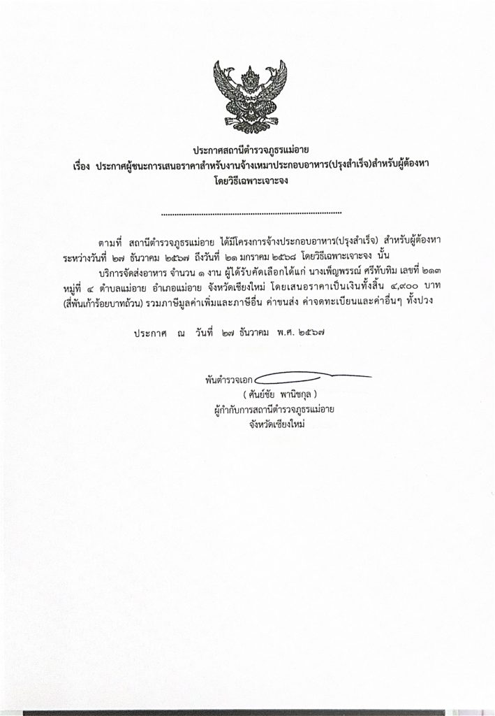ประกาศผู้ชนะการเสนอราคาสำหรับการจ้างเหมาประกอบอาหารสำหรับผู้ต้องหา