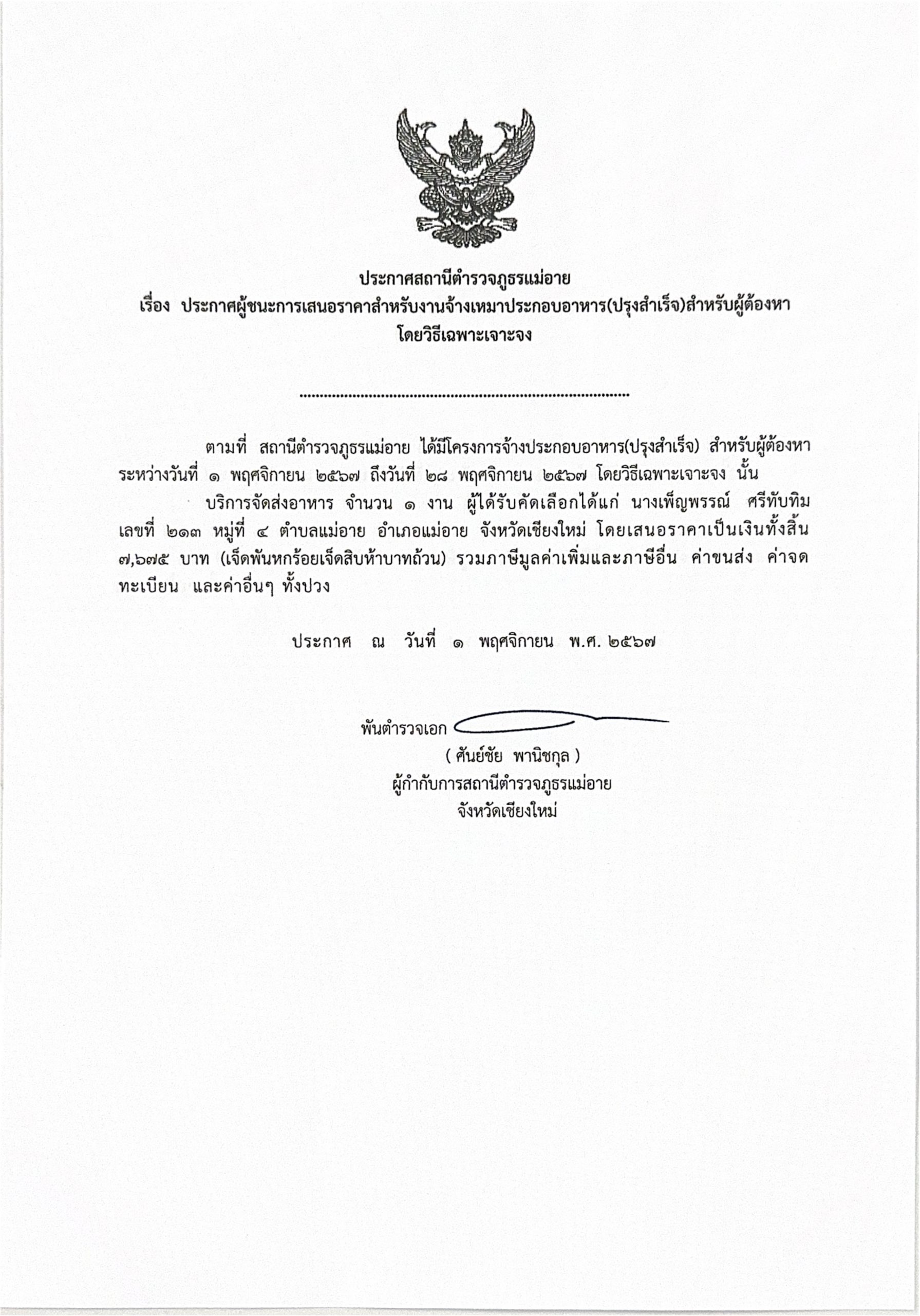 ประกาศผู้ชนะการเสนอราคาสำหรับการจ้างเหมาประกอบอาหารสำหรับผู้ต้องหา