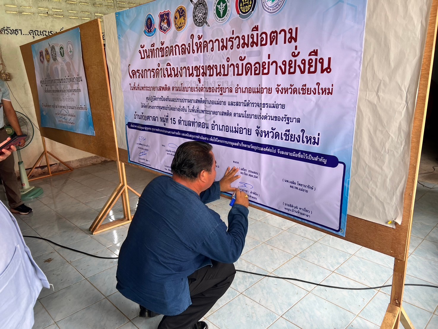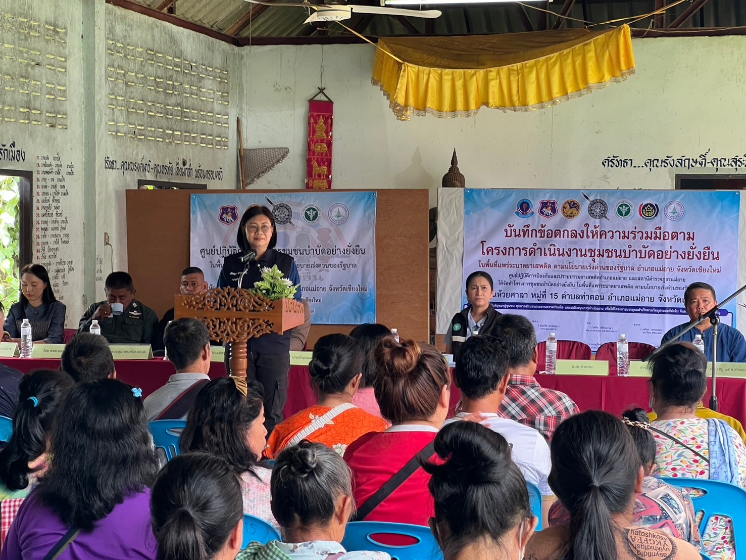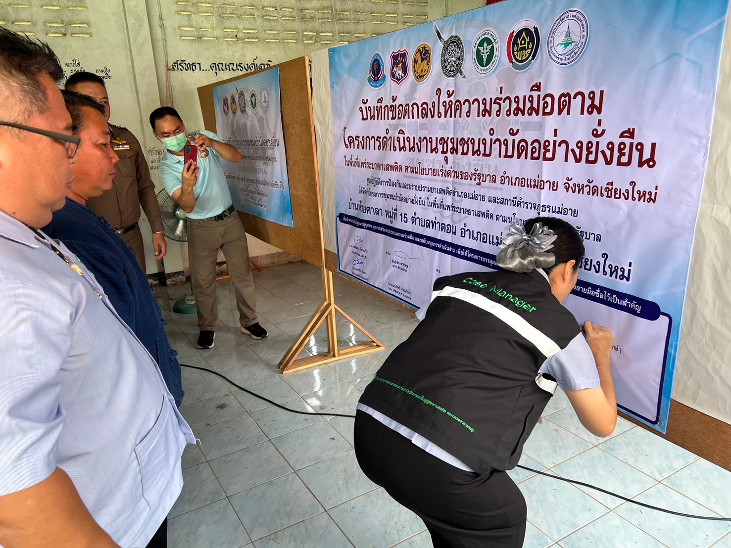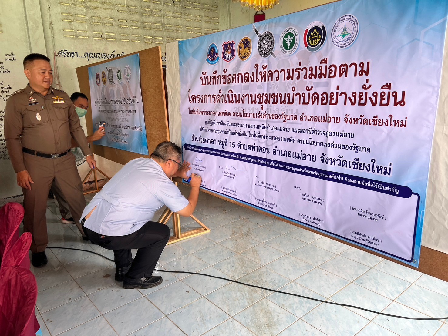ร่วมพิธีเปิดและลงนามความร่วมมือ( MOU ) ” โครงการชุมชนบำบัดอย่างยั่งยืนในพื้นที่แพร่ระบาดยาเสพติด ตามนโยบายเร่งด่วนของรัฐบาล ” และเปิดศูนย์ฯปฏิบัติการ ฯ ณ ศาลาอเนกประสงค์ บ้านห้วยศาลา ม.15 ต.ท่าตอน อ.แม่อาย จว.เชียงใหม่ โดยมี นางสลีลญา คำภาแก้ว นายอำเภอแม่อาย เป็นประธานในพิธีเปิ