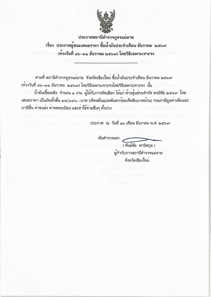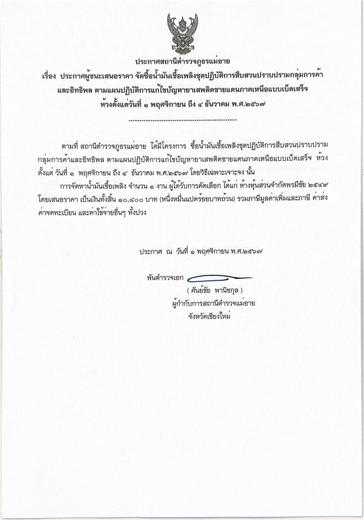 ประกาศผู้ชนะเสนอราคาซื้อน้ำมัน สกัดกั้นปราบปรามการผลิตการค้ายาเสพติด