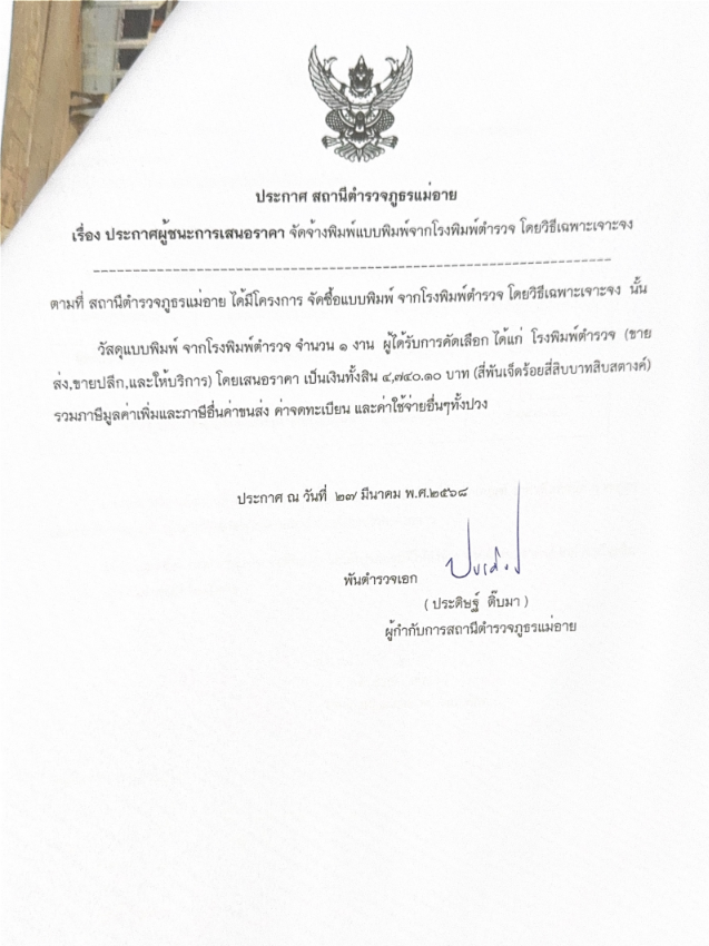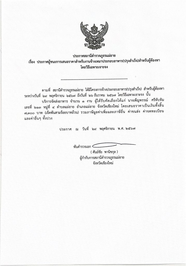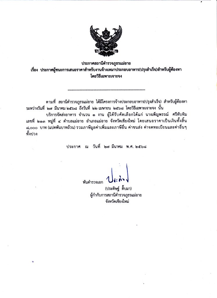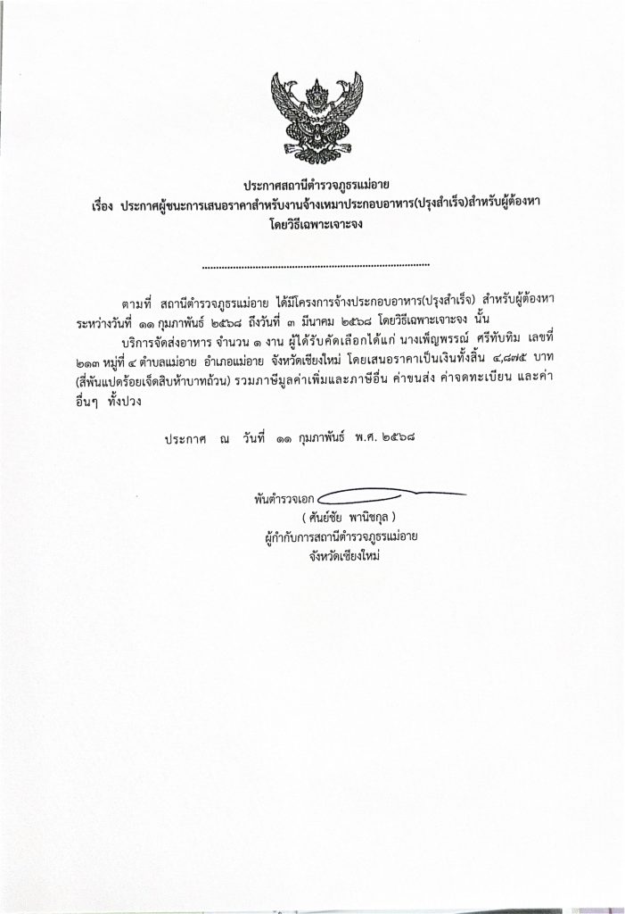ประกาศผู้ชนะการเสนอราคาสำหรับการจ้างเหมาประกอบอาหารสำหรับผู้ต้องหา