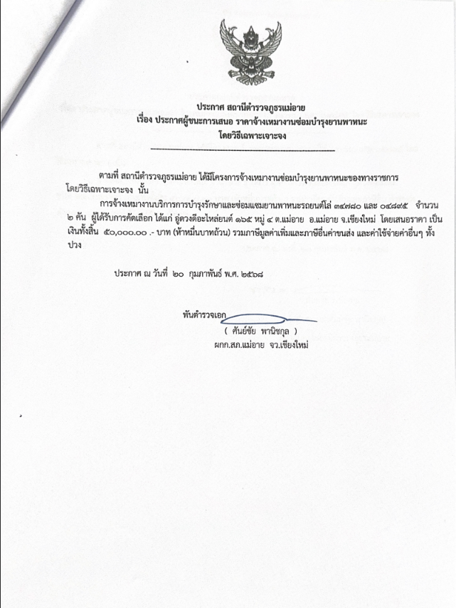 ประกาศจ้างเหมาซ่อมแซมรถยนต์ของทางราชการ